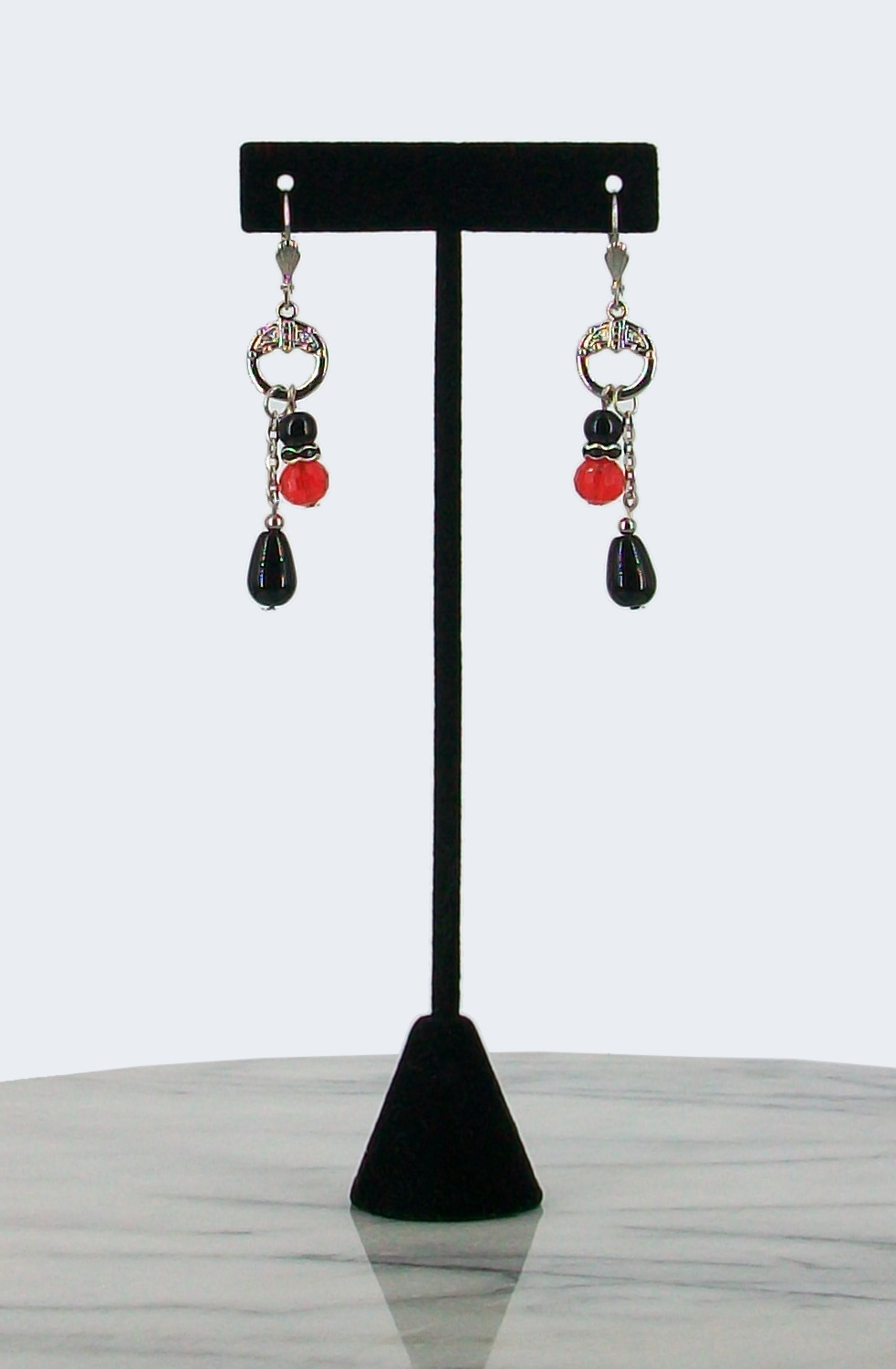 (BO-241A) — Boucles d’oreilles à crochets fermés avec leviers assorties avec le Collier Maraschino, mesurant environ 5 cm (2 po). Billes rondes et en forme de goutte en verre noir et cristal rouge. Chaînes et gros anneaux à motifs en métal plaqué argent antique.