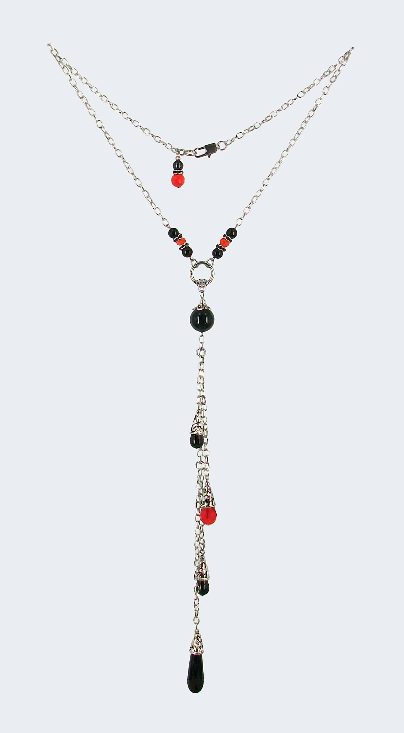 (CO-241) — Flamboyant collier avec chaîne plaquée argent antique mesurant environ cm (), agrémenté d’un long pendentif mesurant environ, composé d’une grosse bille en verre noir et d’une cascade descendante de chaînes auxquelles sont suspendues des billes en formes de gouttes en verre noir et d’un cristal rouge. Bille ronde en verre noir et en cristal rouge. Capuchon de billes en forme de cône, anneaux et fermoir homard en métal plaqué argent antique.